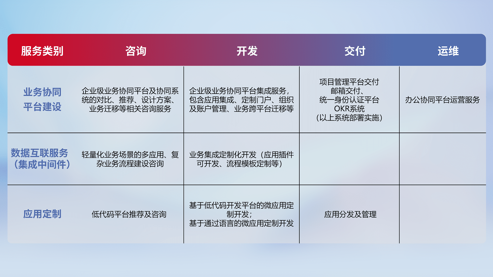 针对钉钉、、、企微、、、IDaas等平台级产品提供产品的规划、、方案、、交付、、、、定制化开发等服务,,,实现如统一协同办公、、、智能客户服务、、、混合会议管理、、、、智能数据查询、、等业务场景,,实现数字化转型。。。