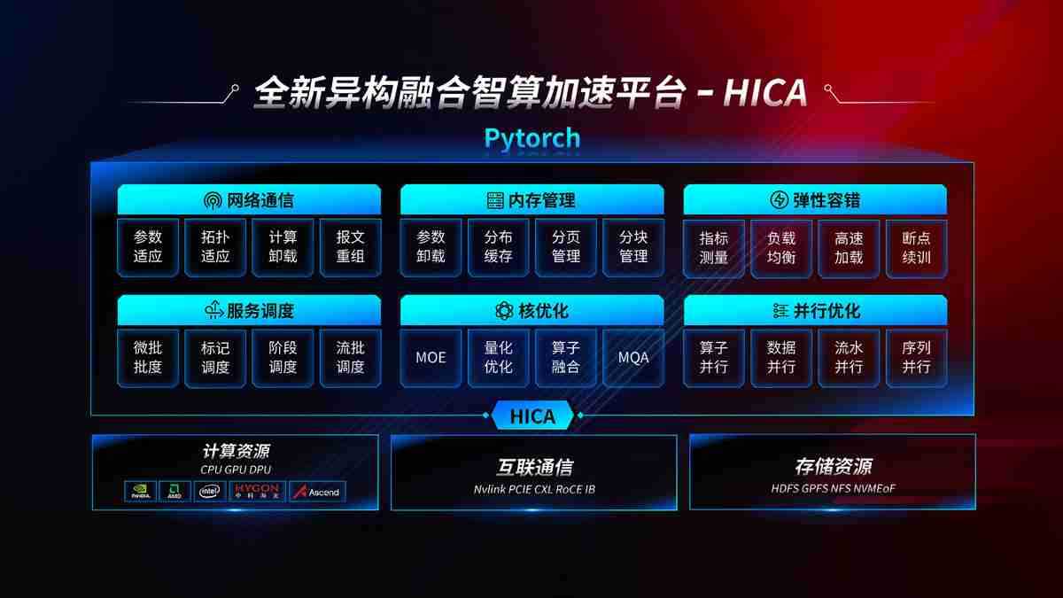 通过自研的服务层、、、、中间适配层、、、、以及调度编排算法,,,,采用数据并行、、模型并行等多种并行方式,,,,把并行计算任务进行有效的分解,,,使其分别由相应的软件栈和算力资源来承接。。。。当GPU资源变化,,,HICA可以实时动态调度计算子任务并调整模型拓扑和架构,,,以充分聚合各种算力资源。。。。