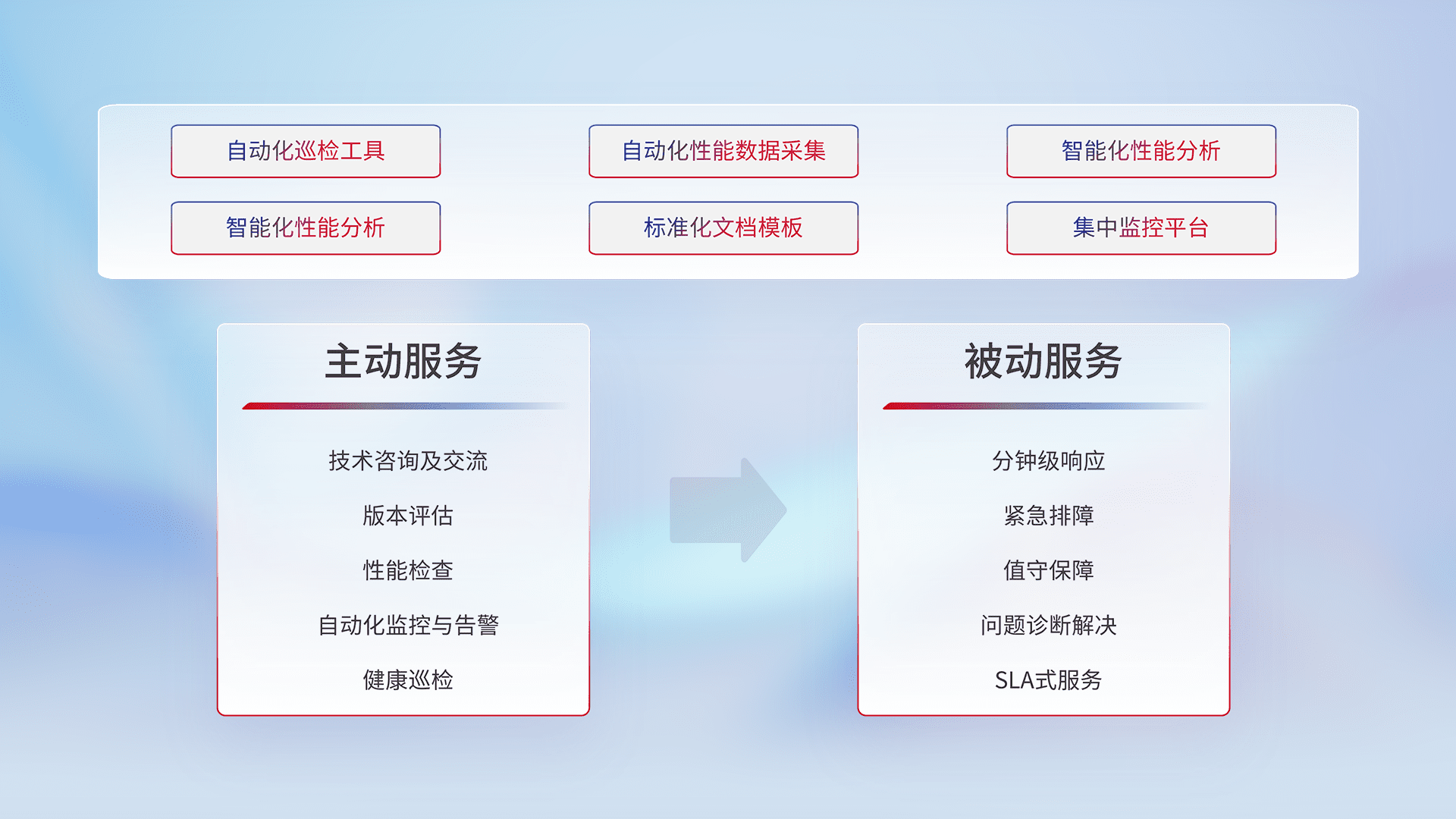 智能化工具和标准化文档,,,保障服务质量,,提供主动服务(包含技术咨询、、版本评估、、、、性能检查、、、自动化监控与告警、、、、健康巡检)和被动服务包含(分钟级响应、、、、紧急排障、、值守保障、、问题诊断解决、、SLA服务)。。。